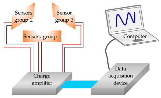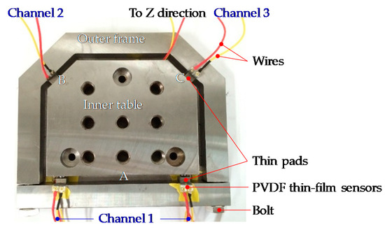 To validate the proposed concept, a working table with embedded PVDF sensors was manufactured and assembled, as shown in Figure 6. The prototype table is made of 45 steel, and preloading is applied on the sensors in the assembly process. A multi-channel charge amplifier is connected to the PVDF sensors, it is then connected to a DEWEsoft data acquisition system for signal recording. The piezoelectric constant d33 of the PVDF sensor is 43.94 pC/N, the sensitivity of the charge amplifier is 0.1 mV/pC, its working frequency range is from 0.8 Hz to 10 kHz. The collected charge signal can be directly converted into the cutting force output through the setting in the data acquisition system.