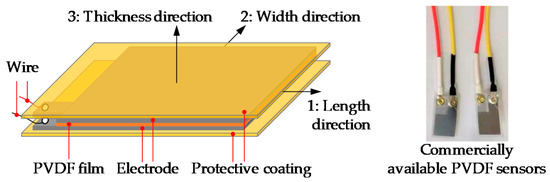 As shown in Figure 3, a PVDF sensor has a multilayer sandwich structure consisting of a PVDF thin-film, two electrodes, the whole structure is wrapped by coatings for protection and insulation. The total thickness of the sensor can vary from 10 μm to hundreds of micrometers according to its application. When an external force component is applied on the PVDF sensor, the electric charges generated by the mechanical strains of the sensor can be computed by integrating the electric displacements over the electrode area as follows [24]: