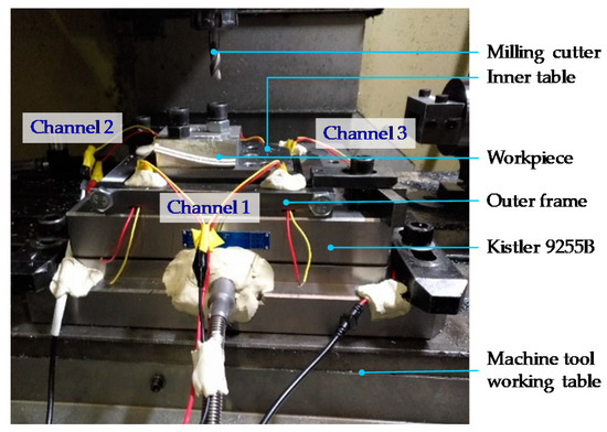 The material used for validation is aluminum alloy, the cutter is a 10.0 mm diameter HSS flat-end milling cutter with three flutes. The developed instrumented table is fixed on the top of a Kistler 9255B dynamometer, a SA-PE03 charge amplifier (Shiao, Wuxi, China) and a STG data acquisition device (DEWESoft SIRIUSi-SYSTEM, Trbovlje, Slovenia) are connected to the table. Dry cutting condition is applied in the milling test to avoid the influence of cutting fluid on cutting forces and to avoid the damage to the developed monitoring system. To validate the instrumented working table, a certain cutting parameters range with axial and radial cutting depth varies from 1 to 3 mm are applied, and the spindle speed varies from 2000 rpm to 4000 rpm. The experimental setup is shown in Figure 7, and the cutting parameters are shown in Table 1.