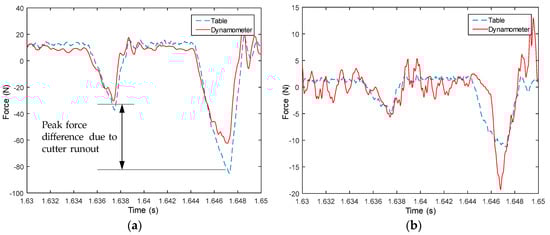 Measured cutting forces for experiments with spindle speed 4000 rpm, feedrate 500 mm/min, axial cutting depth 3 mm and radial cutting depth 3 mm in the (a) X direction and (b) Y direction.