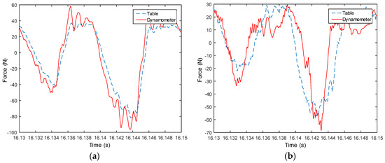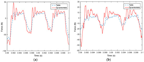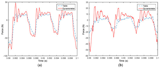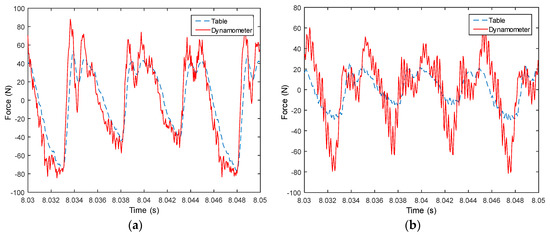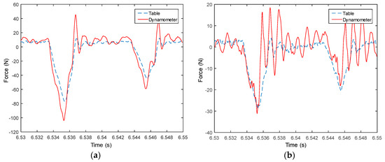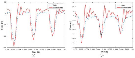 Measured signals from the table are used to compute forces in both X and Y directions, and then compared with measured forces from the dynamometer, as shown from Figure 8, Figure 9, Figure 10, Figure 11, Figure 12, Figure 13 and Figure 14. Results show that measured forces in the X direction from both the developed instrumented working table and the dynamometer match well in terms of the value, profile and details. In the Y direction, the tendency of both force value and profile are almost the same, except some deviations in the profile for those in Figure 13 and Figure 14. Force signals from the dynamometer in Figure 9 and Figure 13 show different degrees of vibration. These differences and vibration may due to the non-rigid connection between the developed working table and the dynamometer. Besides the force value and profile, the cutter runout in the milling process are well recognized by the developed working table, which is shown by the peak force difference for the neighboring teeth, as shown in those figures.