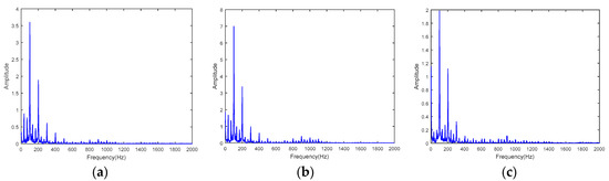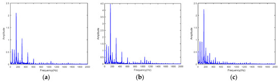 Spectrum analysis results for milling tests with spindle speed 2000 rpm. (a) Channel one, (b) channel two, and (c) channel three.