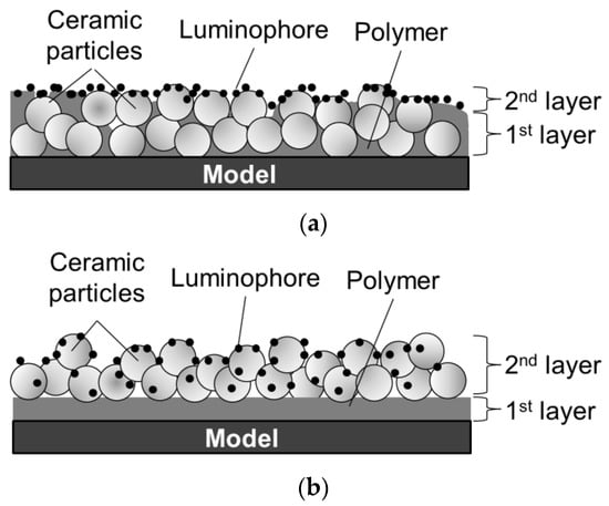 Numerous studies have examined the improvement of PC-PSP characteristics. For instance, Sato et al. [14] proposed a new coating procedure to improve the time response of PC-PSP. For conventional PC-PSPs, ceramic particles are added to a polymer solution, which is sprayed together on a test article, as shown in Figure 1a. On the other hand, in Sato’s procedure, ceramic particles are added to a dye solution and are adsorbed onto a pre-coated polymer film. They reported that a faster time response could be achieved using the new coating procedure. Moreover, the surface roughness of Sato’s PC-PSP is lower than the admissible roughness in a conventional wind tunnel test. It has been estimated that the coating film structure is as shown in Figure 1b, but micro-scale observation of the coating film structure has not been conducted, and structure is not well understood. In the present paper, the conventional PC-PSP and the new PC-PSP are referred to, respectively, as the dye-adsorbed (D-adsorbed) PSP and the particle/dye adsorbed (PD-adsorbed) PSP.