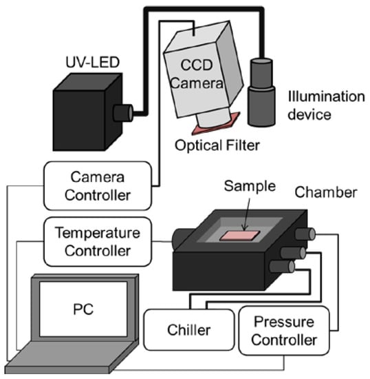 The pressure and temperature sensitivities of PSP were evaluated using a chamber in which the inner pressure and the base temperature could be controlled. The schematic diagram of the static calibration system is shown in Figure 2.