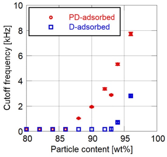 Both the cutoff frequency and surface roughness increase as the particle mass content increases. Their rates of increase change at 86 to 88 wt% for the PD-adsorbed PSP and at 92 to 94 wt% for the D-adsorbed PSP. These mass contents correspond to the CPVC, and the CPVC for the PD-adsorbed PSP is smaller than that for the D-adsorbed PSP. Note that the cutoff frequencies of PSP containing fewer particles than the CPVC are less than 150 Hz, which is the lowest achievable frequency using the acoustic resonance tube.
