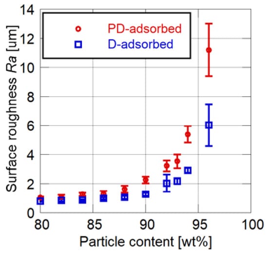 Figure 14a indicates that the histogram is skewed left and skewness is negative for the D-adsorbed PSP with a particle content of 80 wt%. This means that a large surface area is occupied by polymer. On the other hand, the histogram is skewed right and skewness is positive for the D-adsorbed PSP with a particle content of 93 wt%, as shown in Figure 14b. This indicates the presence of many particles on the surface. Kurtosis measures the degree to which a distribution is more or less peaked than a normal distribution and indicates the homogeneity of coating surface. For the D-adsorbed PSP with a particle content of 80 wt%, the film surface is mostly occupied by the polymer. In this case, the histogram is relatively peaked and kurtosis is positive. For the D-adsorbed PSP with a particle content of 90 wt%, particles and pores appear on the entire surface. In this case, the histogram is relatively flat and kurtosis is negative.