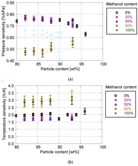 Static sensitivity characteristics related to methanol content for particle/dye solution. (a) Pressure sensitivity; (b) Temperature sensitivity.