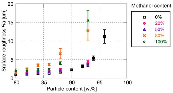 Figure 8 and Figure 9 show the effects of solvent on the cutoff frequency and surface roughness, respectively. Similarly to the sensitivity characteristics, the time response and surface roughness are not affected by the addition of 50 wt% or less of methanol. In this case, the cutoff frequency and surface roughness increase with the increase in particle mass content. When the proportion of methanol exceeds 80%, the time response is drastically improved to more than 6 kHz. The cutoff frequency changes little depending on the particle mass content, whereas the surface roughness changes significantly. When the ratio of methanol is greater than 80%, the increasing rate of surface roughness with respect to the particle mass content is much larger, as compared with the use of pure toluene as the particle/dye solvent.