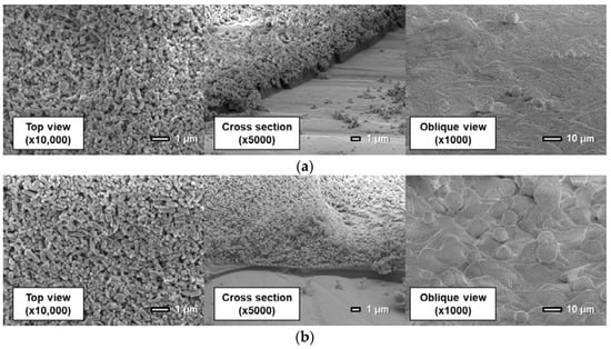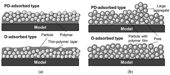 First, the coating film structure of the D-adsorbed PSP is investigated. When the coating film contains 80 wt% particles (Figure 11a), the coating film consists of two layers: a lower particle-rich layer and an upper polymer-rich layer. This state results from the high specific gravity of TiO2 particles. Before the solvent is volatilized and the film is formed, TiO2 particles sink to the lower layer by their own weight. When the coating film contains 93 wt% particles (Figure 11b), particles form small pores in the coating film. Moreover, polymer cannot be seen clearly in the image.