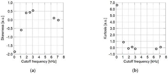 Statistics of brightness histograms of SEM images related to cutoff frequency. (a) Skewness; (b) Kurtosis.