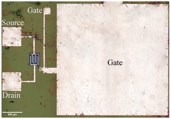 EGFETs were designed as devices that had to improve the limits, in terms of the output variability of ISFETs, and their performance has been investigated under various conditions such as temperature [41], light exposure [31], and different chemical environments [28]. As compared to ISFETs, they have shown greater chemical and thermal stability as well as better output stability under different incident light conditions, and increased current sensitivity [41,42]. EGFET devices have been widely used in bioanalytical applications for detection of pH, enzymes, and proteins [28,43]. As far as their design is concerned, different topologies have been reported. Figure 2 shows an example of an integrated circuit, in which the noteworthy dimensions of the gate electrode (sensitive area) are evident as compared to the source and drain electrodes.