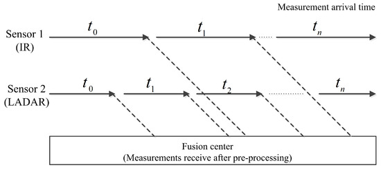 Measurement acquisition rates differ widely depending on several variables. Therefore, when fusing data from multiple sensors, there is a mismatch in measurement arrival time; for example, data processed from an image processor will be more time-consuming compared to a radar signal being processed. Measurement delays occur due to sensor diversity, transmission delay in the communication network, and uncertainty in preprocessing times when large numbers of measurements are processed in limited resources [6]. As a result, measurements from the same target appear at the fusion center with varying random time delays, and measurements of such a kind are called out-of-sequence measurements (OOSMs). In the OOSM scenario, the fusion center receives measurements produced at a prior time. As explained earlier, this may occur if the measurement arrival was subject to unexpected transmission delays when compared to the delays associated with the expected measurement arrival time. The issue here is that of determining a process of including these OOSMs into a track that has already been updated with a measurement at a later time. In recent years, many optimal and suboptimal filtering techniques have been developed for the handling of single and multiple lag OOSMs [7,8]. An important characteristic of all these OOSM filtering techniques is to compute state estimates, correlative covariance and cross-covariance within the state and delayed measurement [7].