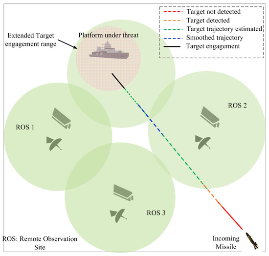 The scenario and use of the algorithm is depicted in Figure 2. A high-speed sea-skimming missile is launched toward the protected platform from a distance. There is always little time between detection and time to impact when tracking a supersonic target in cluttered environment. In the proposed EWS, trajectory of the threat is estimated and smoothed after detection by a ROS. The target trajectory along with accurate time to impact and other parameters of interest are provided in advance to the targeted platform. Thus, the proposed technique helps the ROS in serving as an early-warning system for the targeted platform in practical situations, i.e., tracking with multiple sensors with OOSM and a cluttered environment.