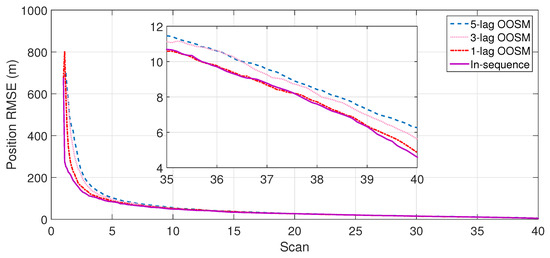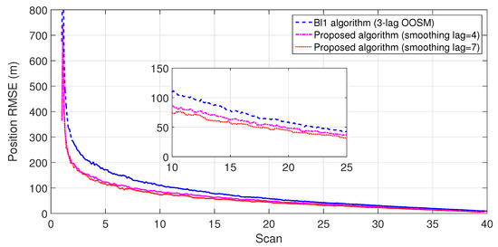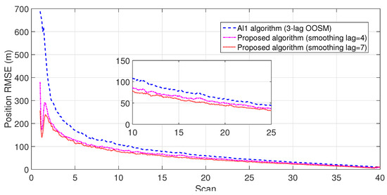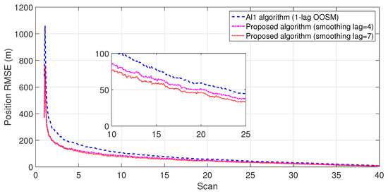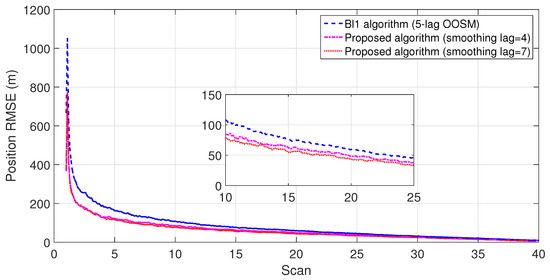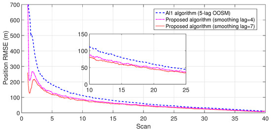 In the proposed algorithm, RTS fixed-lag smoothing enhancement is performed in the filtered estimates to further improve the estimation accuracy. In each simulation run, the fixed lag of four and seven scans was considered, and a batch of four and seven scans was formed. The eldest measurement scan was replaced with new measurement scan in each cycle. For a fixed lag value of N = 4, the measurement scans for the first and second batch are , and , respectively, and so on. For fixed value , measurement scans for the first and second batch are , and , and so on.