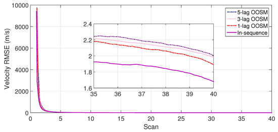 The experiment consisted of 500 Monte Carlo runs, with each run consisting of 391 scans. For velocity and position, simulation results of the suboptimal and optimal algorithms for both single- and multiple-lag OOSMs in a cluttered environment are presented in Figure 5, Figure 6, Figure 7 and Figure 8 for both position and velocity. The performance of both the OOSM filtering algorithms is also compared to the sequentially obtained readings from IR and LADAR presented in Reference [2]. Based on the results shown in Figure 5, Figure 6, Figure 7 and Figure 8, it is evident that, in terms of RMSE, both algorithms have improved performance estimation. During state retrodiction, the optimal Al1 algorithm contains the effects of process noise; however, suboptimal algorithm Bl1 ignores the process noise during state retrodiction. For multiple-lag OOSMs, such as three and five lags, the RMS error value of both algorithms increases. These RMS error values are presented in Figure 5, Figure 6, Figure 7 and Figure 8. In Table 2 and Table 3, the computational complexity for algorithms Al1 and Bl1 is presented for different lag values and based on the information presented in the table. It is clear that the computational complexity of Bl1 algorithm is less than that of the Al1 algorithm. For multiple-lag OOSMs, computational complexity value increases for both algorithms. From the simulation results, it is observed that performance estimation is identical for both algorithms; however, practical implementations and system requirements are also an important factor for algorithm selection.
