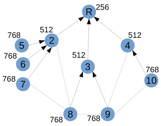 Consider again the network depicted in Figure 1, where the DODAG is represented as a set of arrows, from each node to its respective parent, and dotted segments identify neighbors with no parent relationship. The rank of any node, the number illustrated by the node, is calculated as the rank of its parent plus a value that depends on the quality of the link between that node and its parent (e.g., in OF0). For example, node 8 chooses node 3 (it could have chosen 2 as well) as its parent because it perceives with it a lower rank than with 7 or 9. After choosing a parent, the node keeps that parent until another neighbor offers a rank significantly better than the one of its current parent—where it is significantly quantified by a threshold (e.g., 640 in 6TiSCH by default).