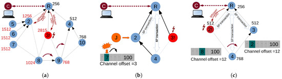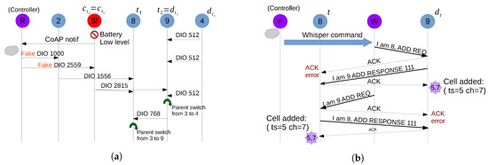Whisper can also be used for managing the scheduling plane. Consider the network in Figure 2b which runs 6TiSCH. Suppose that a malicious node starts a jamming attack that selectively interferes with the cell (7,3) between 2 and 4. If the interference persists (i.e., follows the channel hopping pattern), the ETX in the link will eventually be increased and will provoke an undesired switch from 2 to 3. Note that the same would happen if a non-malicious node causes many collisions due to an uncoupled scheduling. The Whisper controller can trigger 6P commands so as to allocate and deallocate cells between 2 and 4, and make the nodes use the cells with higher Packet Delivery Ratio (PDR), avoiding the parent switch.