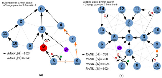 Figure 4 shows two examples where a single centralized controller cannot perform a specific routing change. In Example 1 in Figure 4a, the policies to accomplish are Energy and Load balancing. This means that when node 6 sends a notification of low battery, its children 8 should try to switch to the next parent candidate, i.e., 9. In this case, Algorithm 3 would report that a Whisper node is required since the parent switch of node 8 could not be done remotely from the controller without undesired parent changes such as the one of 6 from node 3 towards node 4. This is because the perceived rank difference in 8 between 6 and 9 is so large that an eventual increase in the branch of 3 used for stabilizing the switch (i.e., overcome the hysteresis threshold to avoid switching back) would force 6 to change its parent to 4, and therefore change its branch (which may not be interesting in terms of load balancing). If a W node is present, it could, by using a Primitive 4, relay node 8’s traffic through W towards 9 without altering the rank in the branch of 3.