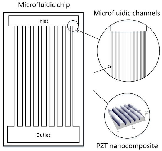 Schematic view of a microfluidic microchip and close-up of the channels, as well as the lead zirconate titanate (PZT) nanocomposite location.