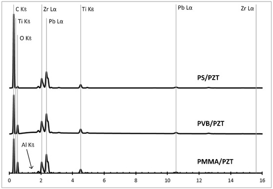 Energy dispersive spectrum of the PMMA/PZT, PVB/PZT, and PS/PZT samples.