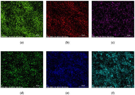From the PMMA/PZT sample ED spectrum (Figure 6) C Kβ energy resolution, the peak was specified at about 0.2 keV. For the O Kβ energy resolution, the peak was specified at about 0.5 keV. For the Ti Kβ energy resolution, the peak was specified at about 0.4 keV and 4.5 keV. For the Al Kβ energy resolution, the peak was specified at about 1.4 keV. For Zr Lα, the peak was achieved at 2.1 keV and 15.8 keV. For Pb Lα, the peak was achieved at 2.4 keV and 10.5 keV. Thus, the values were almost identical to the PVB/PZT sample, except that the aluminum element appeared. The map of the distribution and relative proportion (intensity) of defined elements over the scanned area and chemical characterization of the sample are presented in Table 2 and Figure 8.