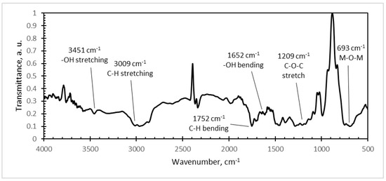 Strong and broad absorption peaks were observed at 3451 cm−1 (–OH stretch), 3009 cm−1 (C–H stretch), 1752 cm−1 (C–H bend), 1652 cm−1 (–OH bend), and 1209 cm−1 (C–O–C stretch) in the PMMA/PZT FTIR spectra (Figure 11). The entire array of these peaks corresponds to the FTIR absorbance spectra of polymethyl methacrylate (PMMA) [34].