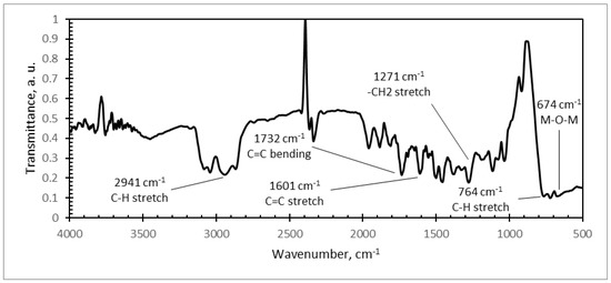 PMMA/PZT FTIR spectra are given in Figure 12. Absorption peaks were observed at 2941 cm−1 (C–H stretch), 1732 cm−1 (C=C bend), 1601 cm−1 (C=C stretch), 1271 cm−1 (–CH2 stretch), and 764 cm−1 (C–H stretch). The received results correspond to the FTIR absorbance spectra of polystyrene (PS) [35].
