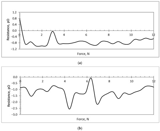 The force-resistance relationship in all three samples (Figure 13) was linear or ascending from a certain point. For the PVB/PZT coating, this relationship became linear from ~3 N force and up (Figure 13a). Increasing force, only small changes of resistance were observed. For the PMMA/PZT coating, the resistance dramatically dropped at ~4.2 N force and then started increasing with increasing force (Figure 13b). For the PS/PZT coating, the resistance dropped till the force reached ~7 N and then started to linearly increase (Figure 13c). Thus, this piezoelectric film had an obvious turn-on threshold, i.e., a force that must be present before the resistance dropped to a value below 7 pΩ, where the relationship became more linear. The results showed that the resistance of the piezoelectric coating was highly dependent on the type of binder. All three experiments were held 15 times each with the same environmental conditions. Figure 13 shows only the average of all measurements.
