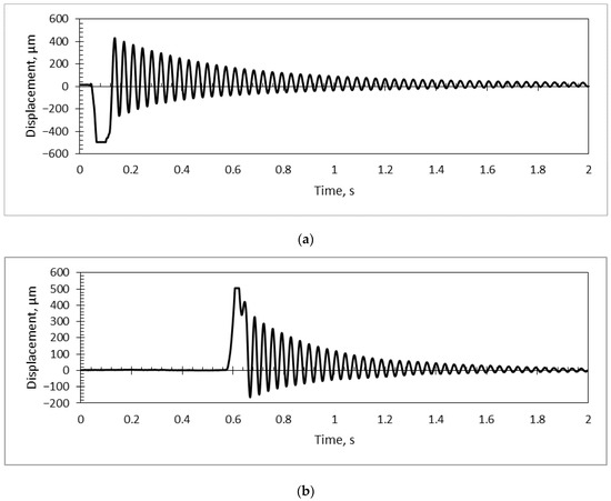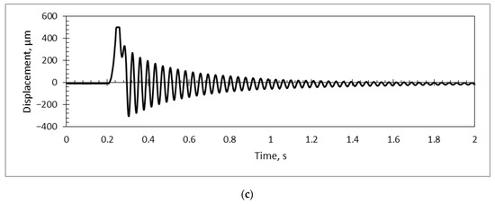 Using the PicoScope system together with a simulation model in COMSOL Multiphysics (for calculations of the first vibration mode), a dynamic analysis was performed for each sample, suspending a mass on a pendulum and releasing it to hit the sample, then stopping the pendulum after contact. A vibrational response of the PS/PZT coating to a mechanical impulse was registered (Figure 15).