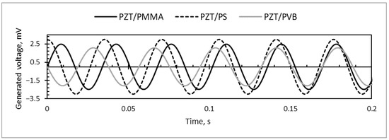 When the direct piezoelectric effect for further investigations of the designed microresonators was applied, the results showed that periodically-excited specimens were able to generate electrical potential due to the piezoelectric effect of the PZT material (Figure 17). The highest value of the harvested electrical energy was registered in the PS/PZT microresonator (up to 3 mV of generated voltage). The lowest result was 2.1 mV, indicated for PVB/PZT, and PMMA/PZT generated up to a 2.5-mV voltage.