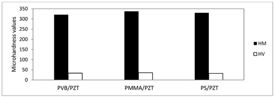 The highest Young’s modulus value was obtained for the PMMA/PZT coating (6.3 GPa), while usage of PS and PVB led to a lower stiffness of 5.3 and 3.9 GPa, respectively. Since 80% of the designed material consisted of PZT nanoparticles and only 20% of binding material (PVB, PMMA, or PS), this allowed reducing the Young modulus approximately 10 times. The obtained experimental results were in good correlation with the results founded in the literature: the Young’s modulus of PMMA was 6.3 GPa [41] and PS 5.3 GPa [42], and PVB had the lowest modulus of elasticity of 3.9 GPa [43].