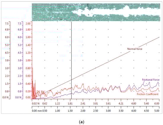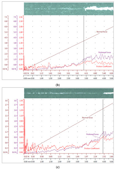 Data recorded during the scratch test: frictional force, normal force, friction coefficient, and the corresponding panorama image of (a) PVB/PZT, (b) PMMA/PZT, and (c) PS/PZT coatings.