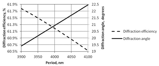 Diffraction efficiency and diffraction angle versus period of periodical microstructure.