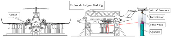 The structure of an aircraft forms the basis of aircraft flight safety. In order to guarantee flight safety and predict the service life of the aircraft structure accurately, structural fatigue loading tests [1] must be carried out on the ground. According to the classic “bottom-top” approach [2,3], the aircraft full-scale fatigue test is located in the top of the “bottom-top” approach, which is the closest to the real fight situation. The FAA (Federal Aviation Administration), EASA (European Aviation Safety Administration), and CAAC (Civil Aviation Administration of China) have all clearly stated in their respective certification regulations that the full-scale fatigue test verification report must be provided.