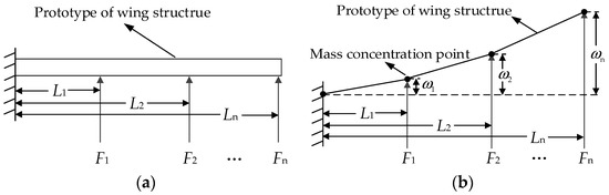 In Figure 2a, the loading object is the cantilever beam which is a simplified model representing the airfoil. The vertical upward arrows represent that the hydraulic cylinders apply force to different position of cantilever beam at the same time. The cantilever beam is naturally divided into n pieces according to the actual position of the loading point. The mass of each section is the percentage of the length of the section multiplied by the total mass. is the loading force of loading channel i. represents the distance from loading point i to the fixed side of the cantilever beam. In Figure 2b, represents the deflection of the loading point i. Here we assume n = 3 and i = 1, 2, 3.