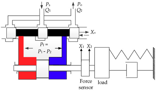 The schematic diagram of the valve-controlled cylinder [22] is shown in Figure 3.