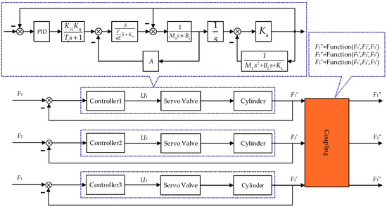 The three-channel coupling force control system is based on three single-channel valve-controlled cylinder systems. The input signal of the couple model is the force output signal of each single loading channel. The output of the couple model can be connected to the load equation and feedback channel of each individual channel. The couple model is the multichannel coupling force dynamics equations deduced from Section 2.3. The above system is the coupling force loading of multichannel. A summary table of all symbols and acronyms is given in Table 1 in the next section.