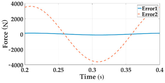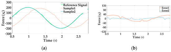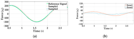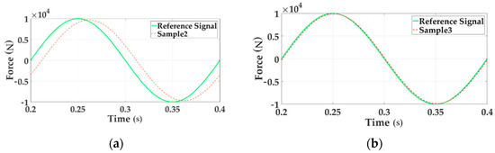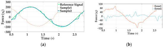 In order to verify the compensation controller proposed in this paper, the corresponding simulation verification is given in Figure 9. The reference signal is the force command input of channel 1. The sample signal shows the system output of Channel 1.