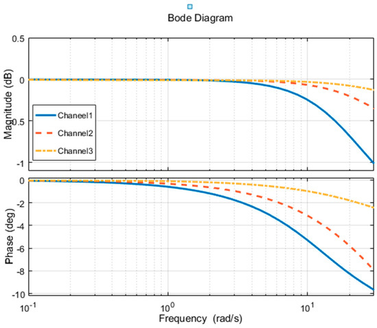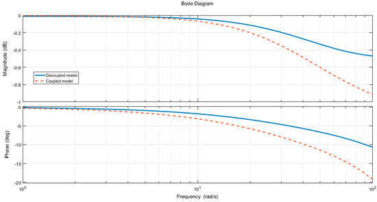 We perform frequency analysis on the decoupling control method. The system’s Bode diagram for decoupling and without decoupling in the control system is shown in Figure 11.