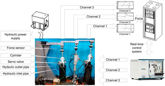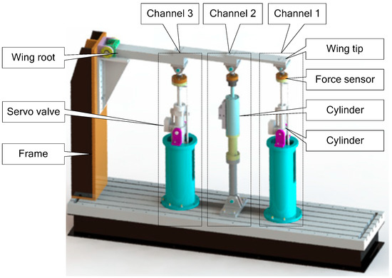 Due to the low rigidity of the aircraft structure and the large deformation, the current loading frequency is only 0.1 Hz. Using a typical aircraft airfoil structural strength test as an example, the span of the airfoil tip and the airfoil root is as long as several tens of meters, and the airfoil tip is deformed by several meters [10]. Typical full-scale fatigue test force loading figure as shown in Figure 1. Accelerating the load frequency slightly will exacerbate the load–force coupling between the different loading channels, causing the loading error of the loading force control to be out of tolerance [11].