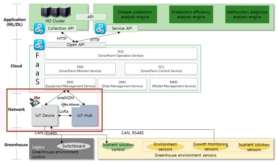 As observed in Table 2, IoT devices based on environmental factors include devices for managing greenhouse environments such as greenhouse main sensors, actuators, or fertilizer controllers. They can be connected with FaaS through IoT-Hub. Wired communication (RS-485, CAN, etc.) is used to communicate with the main sensors, actuators, fertilizer controllers, and the like, while LoRa-based wireless communication is performed with IoT-Hub.