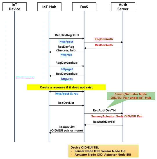 As is apparent in Figure 2 and Table 1, for IoT-Hub to be linked with FaaS, a registration process that implements the server authentication process using the IoT-Hub object identifier (OID) is required. When the OID authentication step is complete, IoT-Hub requests lookup of a given IoT-Hub resource in FaaS using the OID. If the resource does not exist, the resource is created in FaaS based on the OID. When the IoT-Hub resource creation step is finished, IoT-Hub requests a list of IoT devices connected to FaaS via IoT-Hub (the OID and extended unique identifier (EUI) pair). If IoT-Hub receives the list of IoT devices in a normal manner, the registration process is complete. The registration process is executed whenever power is applied to IoT-Hub, and the resource creation process is omitted if the target IoT-Hub resource already exists in FaaS.
