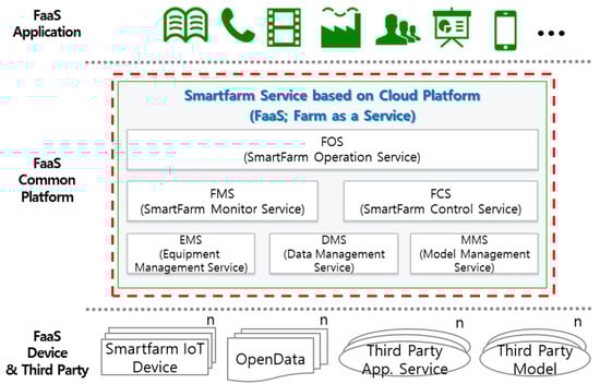 In this study, the cloud-based Farm as a Service (FaaS) system is proposed, which is capable of handling the collection, analysis, and prediction of agricultural environment information on one common platform. The proposed FaaS is a common platform based on the oneM2M standards and supports openAPI (where API stands for “application programming interface”). Thus, various application services can be developed and collection, control, operation, and management of agricultural data are facilitated [23,24,25]. FaaS virtualizes the resource information of smart farms in various forms based on the Platform as a Service (PaaS) approach and provides environments for service operation and development [26,27]. The smart farm service established by FaaS utilizes cloud-based technology that shares IT infrastructure resources, such as servers, storage, middleware, and networks, through a network. FaaS also virtualizes smart farm devices, such as IoT devices and actuators, for operation. Existing heterogeneous smart farm systems installed and operated by farm households, as well as legacy systems installed and operated individually or separately by different suppliers, can be integrated in FaaS through cloud-based technology, and the farm management function can be used in the form of a cloud service. The proposed smart farm service can provide crop growth information monitoring services according to the requirements of farm households, as well as disease prediction services, through application of cloud computing, IoT, Big Data, and mobile technology to greenhouses, orchards, and livestock barns [28,29].