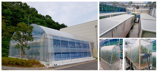 In this study, to construct a disease and pest prediction system for Seolhyang, a South Korean strawberry variety, two linked smart greenhouses were constructed, as shown in Figure 4. Inside the greenhouses, 16 chambers with constant temperature and constant humidity functions were designed, and the Seolhyang infection model was established through tests and analysis.