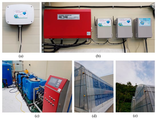 Environmental information collection devices and control devices inside and outside greenhouses: (a) IoT-Hub, (b) IoT devices, (c) nutrient solution supply system, (d) side windows, and (e) skylight.