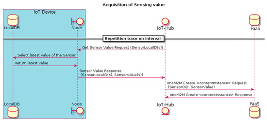 The operation scenario of the IoT device comprises the collection of sensing information and actuator operation. As shown in Figure 6, sensing information is collected at the request of IoT-Hub. IoT-Hub sends sensor value request messages to the IoT device at fixed intervals and selects the target sensor using the Local ID as a parameter. The IoT device receives the request and sends the latest sensor value and sensor Local ID in the sensor value response message. The latest sensor value is an analog value; in the case of a digital sensor, it is converted into an analog value according to a virtual linear rule and transmitted. IoT-Hub receives the sensor value response message and publishes the sensor value to FaaS. FaaS stores the sensor value in the database; in the case of a digital sensor, the transmitted sensor value is first converted back into a digital sensor value and then stored in the database.