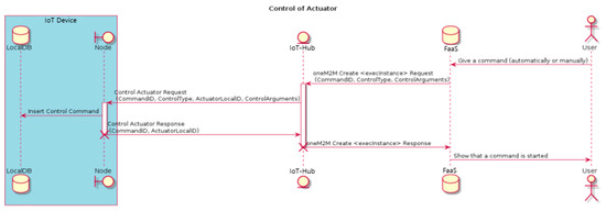 As shown in Figure 7, the user can issue control commands for the controller through the FCS of FaaS. The CommandID and control command are published from the FaaS to IoT-Hub. When the latter receives the control command, it sends a control request message, CommandID, ActuatorLocalID, and parameters to be used for control to the corresponding IoT device connected to the controller. The IoT device begins control for the corresponding controller and sends a control response message with the CommandID. Here, the response indicates that the control command was successfully transmitted, not that control was actually started or completed. When IoT-Hub receives the control start message, FaaS publishes the ID of the control command and a message indicating the start of control.