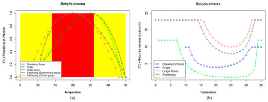 In addition, similar curves were obtained for the Botrytis cinerea infection model applied to other crops, and it was found that, in comparison with other strawberry varieties, Seolhyang is resilient at low temperatures [46,47].