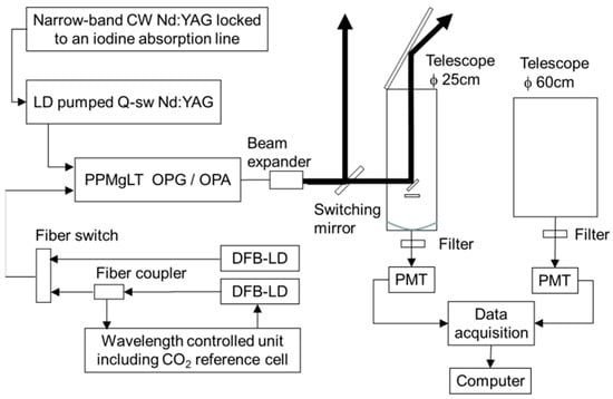 - Shibata, Y.; Nagasawa, C.; Abo, M. Development of 1.6 μm DIAL using OPG/OPA transmitter for measuring atmospheric CO2 concentration profiles. Appl. Opt. 2017, 56, 1194–1201. [Google Scholar] [CrossRef] [PubMed]