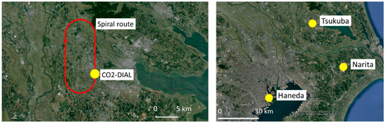 Observation sites where CO2 DIAL (right) and aircraft measurements (left) were made on 12 January 2014 over Tsukuba.